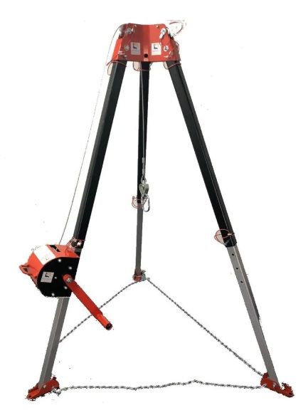 Tripé para trabalho em espaço confinado . Carga - 1200 kgf . Regulagem máxima 2300 mm e mínima 1600 mm. Cabeça , pernas e sapatas com pintura epoxi .